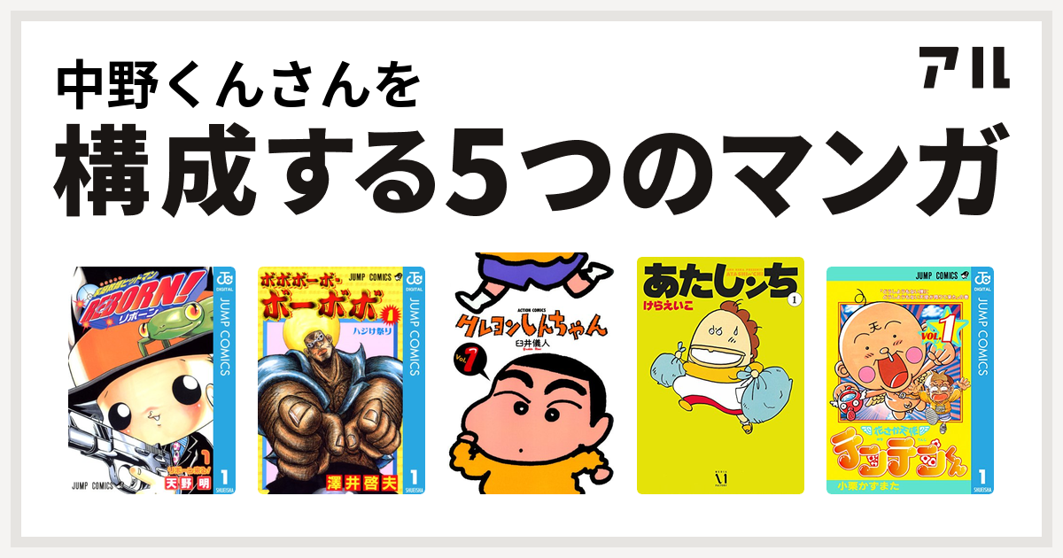 中野くんさんを構成するマンガは家庭教師ヒットマンreborn ボボボーボ ボーボボ クレヨンしんちゃん あたしンち 花さか天使テンテンくん 私を構成する5つのマンガ アル