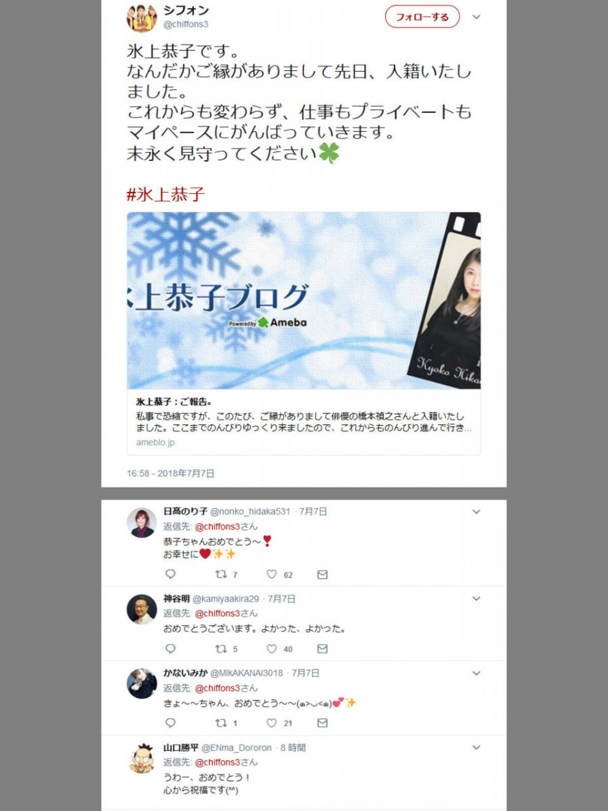声優 氷上恭子さんが俳優 橋本禎之さんと結婚 大物声優さんたちからの祝福ツイート相次ぐ 2018年7月9日 エキサイトニュース