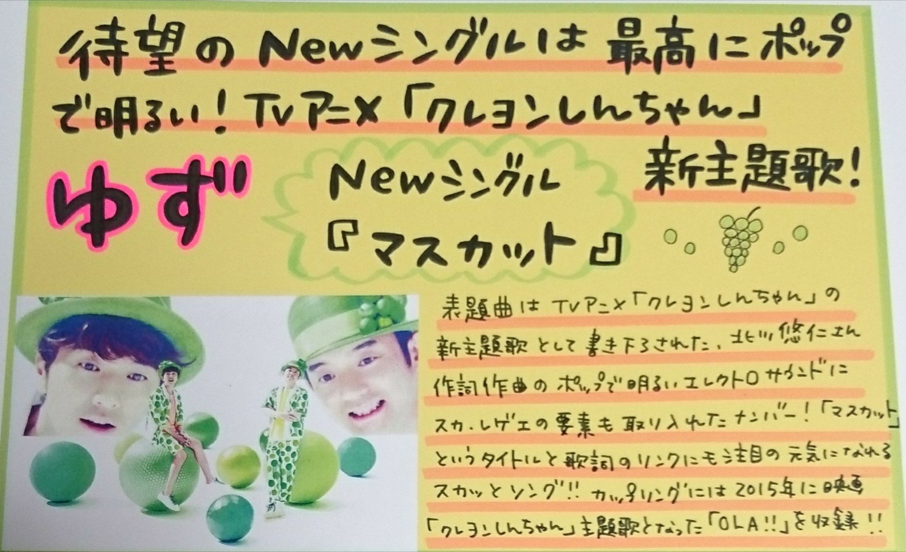 マスカット クレヨンしんちゃんの歌詞ページ 歌手 ゆず アニソン 無料アニメ歌詞閲覧サイト