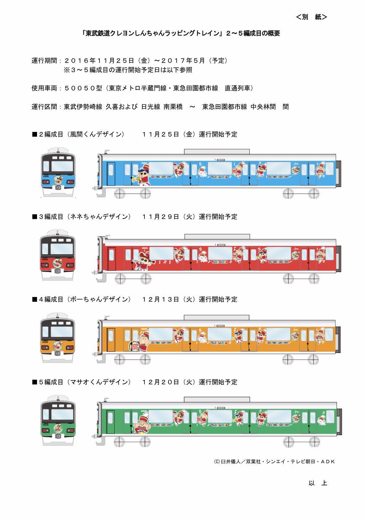 鉄道旅行資料館 on twitter 東武鉄道 3 2016年11月3日より埼玉県春日部市舞台の クレヨンしんちゃん 電車が運行開始 昨日のプレスリリースによると主人公野原しんのすけの友達 風間くん ネネちゃん ボーちゃん マサオくんも登場するとのことで総勢5編成と
