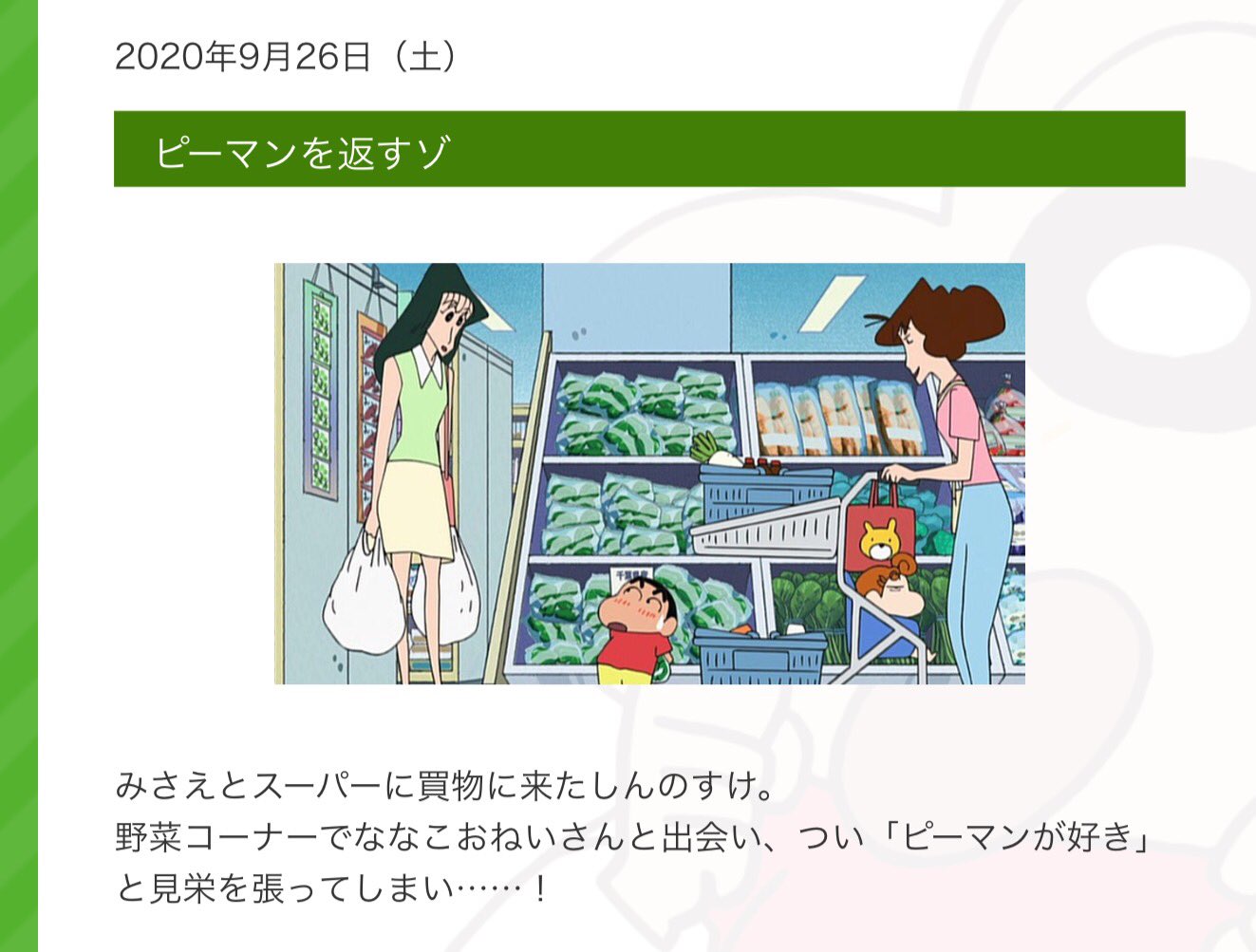 ダイチ on twitter 今日はクレヨンしんちゃん放送日 夕方4時30分から ピーマンを返すために色んな行動 上手く返せるか ひろしと風間くん達がしんちゃん待ち 気を使います 珍しく早起きしたしんちゃん 凄く楽しそう なお話の三本立て しんちゃんがいない