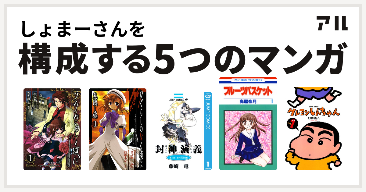 しょまーさんを構成するマンガはうみねこのなく頃に episode1 legend of the golden witch ひぐらしのなく頃に 鬼隠し編 封神演義 フルーツバスケット クレヨンしんちゃん 私を構成する5つのマンガ アル