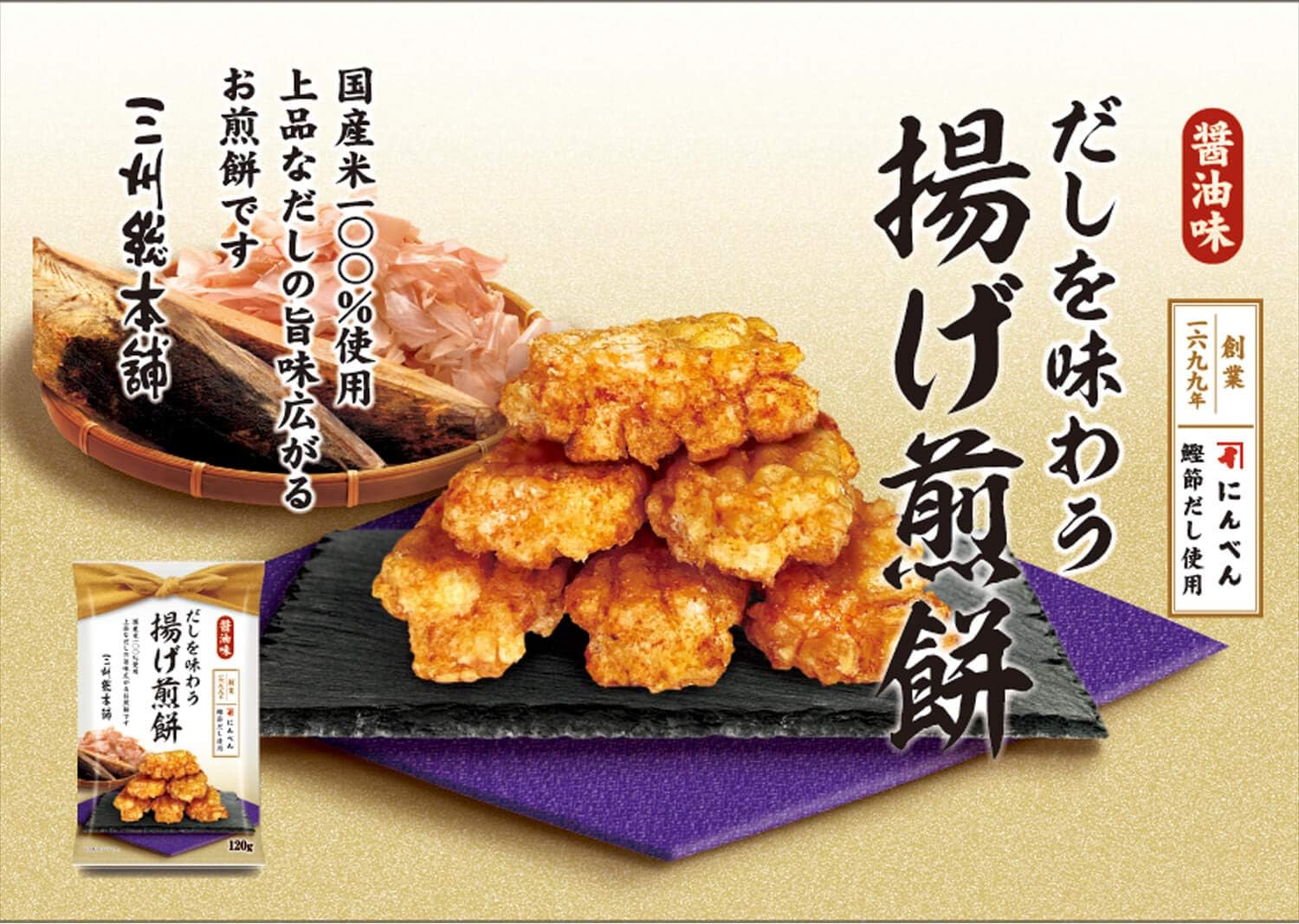 三州総本舗 だしを味わう揚げ煎餅 老舗日本橋にんべんのかつお節だし 近藤醸造の醤油味を使用 サクサクの食感 国産米100 お菓子 おつまみ 醤油味120g 2袋入り 三州総本舗 せんべい 米菓 通販 amazon